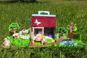 Размер домика в собранном виде 30х20 см, его высота 35 см. Наружные стены – это двустворчатые двери с крылечком, окно и скамеечка, палисадник, терраса с кладовкой и съёмным навесом, огород с норкой для мышки и колодцем. На скатах крыши с одной стороны расположен карман на молнии, в котором хранятся съёмные детали, с другой стороны счёты – подвижные бусины на шнурах от 1 до 10. Сверху на крыше расположена ручка для переноски домика. Стены и крыша крепятся между собой и образуют конструкцию благодаря пуговицам и петелькам из круглой резинки. Когда крыша снимается, а боковые стенки расстёгиваются, они легко подгибаются вниз, и тем самым домик трансформируется в компактный планшет для хранения размером 20х30 и высотой всего 8 см.