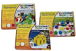 Наборы для лепки из песка «Песочный город», «Мозаичный мир», «Кафе для малышей» из серии материала «Волшебный песок», производитель «Fanssi Products Limited», Китай, соответствует психолого-педагогическим требованиям, «Рекомендован» МОО «Экспертиза для детей» (Знак «Золотого Солнышка»). Свидетельство № 2-12 от 12.05.12