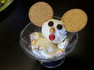 - А теперь небольшое волшебство! Наш Буратино легко превращается в Чебурашку. Нужно заменить вафельный рожок круглыми печеньями-ушами. А длинный нос придётся откусить, чтобы уменьшить его до размеров носа Чебурашки. Вы можете осуществить эти волшебные превращения или создать ещё одно сказочное мороженое в другой креманке.
