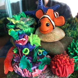 Мы рисовали рыбок, которых хотели слепить, и потом по рисункам или по фотографиям лепили из полимерной глины жителей нашего аквариума. Процесс этот творческий, не требующий прямого соответствия получаемых образов с реальными формами обитателей морского мира. Ребята могли дополнять получаемые фигурки различными декоративными элементами, украшениями. А с кораллами это вообще предпочтительно, так как в них целая палитра всевозможных красок, форм и проявлений (чудеса природы). Поэтому, как говорится, голь на выдумку хитра.