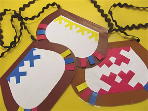 Для работы потребуется несколько предметов: цветная бумага цветная (коричневая и любая другая для контрастных орнаментов), полоски цветной бумаги размером 1х3 сантиметра; белая бумага; тесьма; заготовленные заранее два шаблона из картона большего и меньшего размера, шаблон орнамента.