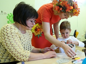 Обучающие задачи: активизировать словарь по теме «Осень», обогащать его прилагательными; закреплять навыки согласования прилагательных с существительными, свободного высказывания в воображаемой ситуации; показать новые условия экспериментирования; закреплять знания о «тёплых» и «холодных» цветах; активизировать умения пользоваться трафаретами, ножницами, точилкой для восковых мелков.