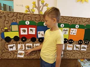 (Ассистент размещает в каждом вагоне картинки с изображением детёнышей диких и домашних животных по количеству в соответствие с порядковым номером вагона. На перроне размещены картинки взрослых животных.) Вот поезд наш едет колеса стучат, а в поезде нашем… Кто же едет в нашем поезде? Сейчас мы узнаем!Кто едет в первом вагончике? (Телёнок и медвежонок.) А во втором? (Жеребята и лисята.) Кто же едет в третьем вагончике? (Козлята, ежата.) В четвертом? (Щенята, бельчата.) В пятом вагончике? (Котята, зайчата.) Кто встречает зайчат? (Зайчонка встречает зайчиха.) Кто встречает лисят? (Лиса встречает лисят.) Кто встречает теленка? (Телёнка встречает корова.) В данной игре мы активизируем словарь по лексическим темам «Дикие и домашние животные». (Ассистент размещает на панно картинки с изображением овощей и фруктов. Игра продолжается.)