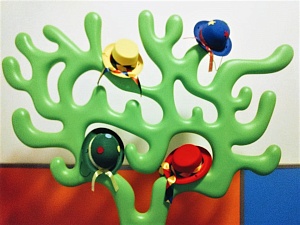 Волшебница: Здравствуйте, гости мои. Вы приехали на мою волшебную станцию, я предлагаю вам поиграть. А игра называется «What color is this hat?», что в переводе обозначает «Какого цвета шляпа?». (Дети считают количество шляп, называют их цвета. Шляпы развешиваются на дереве. Далее дети закрывают глаза, и педагог меняет пару шляп местами. Ребята должны сказать, что изменилось. Затем роль волшебницы исполняет сам ребёнок или его родитель.)