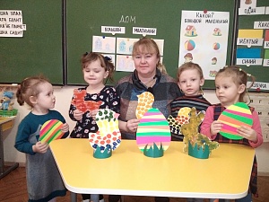 В завершении творческой деятельности педагог предлагает детям поиграть. Игра называется «Самый ловкий». Дети встают в круг, количество яиц на одно меньше чем детей. Под весёлую музыку дети бегают по кругу, когда музыка останавливается, каждый ребёнок должен успеть взять яйцо. Тот, кому не досталось, выходит из игры. Вот такой интересный мастер-класс у нас получился. Желаем и вам творческих успехов!