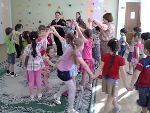 Все дети поднимают сцепленные руки вверх. Ведущий выбирает «воротики», распутывает клубочек. Проходя через воротики, дети опускают сцепленные руки вниз.