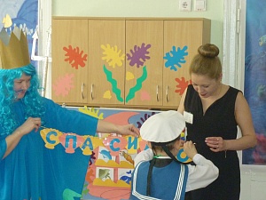 Учитель-логопед: Ребята, вот мы и приплыли! Нас встречает сам морской царь Разноцвет. (Дети выходят из лодки и садятся за столы. Воспитатель одевает костюм морского царя.)