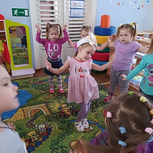 Описание: дети стоят в кругу, проговаривая слова, выполняют действия – хлопают, топая, сходятся в маленький круг, кружатся на месте, разбегаются на свои места. Игра проходит вначале спокойно, затем темп увеличивается.