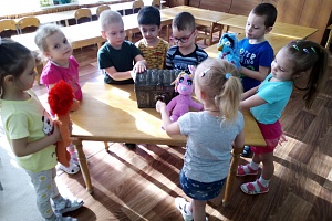 (Дети заходят в группу, на столе стоит сундучок, рядом сидит Пуговка. Они рассматривают сундук, поднимают, но открыть не могут).– Как выдумаете, что может быть в сундучке?