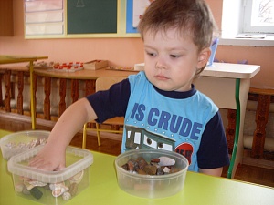 Поиграйте в игру: пусть малыш будет доктором, у которого много баночек с разными лекарствами, или хозяйкой, которая держит в баночках разные крупы. Поставьте перед ребёнком несколько маленьких баночек с закрытыми крышками (банки должны отличаться размером и формой). Предложите ему открыть все баночки, а потом снова закрыть, правильно подобрав крышки. Если крышки закручиваются, проследите, чтобы ребёнок крутил крышку, а не банку.Ракушки и камушки