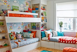 Рекомендуем в детской комнате сделать полочки для дидактических игрушек (пирамидки, матрёшки, настольные игры, конструктор) Там же можно расположить книжки-гармошки, сказки, детские энциклопедии, книги серии «Читаем с мамой», «Читаем сами». Придать уют и создать радостную атмосферу помогут одна-две крупные игрушки, (медведь, слонёнок, собачка), на которые ребёнок может сесть верхом или обнять.