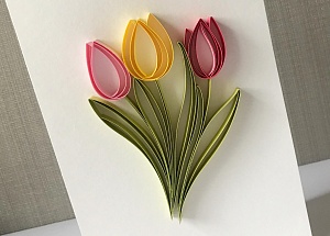 Таким же способом сделайте розовый и тёмно-розовый тюльпан. Когда три тюльпана будут готовы, можно добавить листики между цветами. Возьмите зелёную полоску бумаги, сформируйте форму листочка и приклейте его между цветами. Открытка готова!