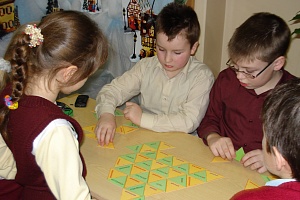 Игрокам поровну раздают большие карточки с проверочным словом (цветом выделен проверяемый согласный), маленькие карточки остаются у ведущего. Он показывает играющим карточку той стороной, на которой напечатано слово с пропущенной буквой, и зачитывает его. Игроки находят у себя проверочное слово, кладут на большую карточку – маленькую, картинкой вверх. Если слово подобрано правильно, то на одной из сторон по периметру карточки составится правильно написанное слово. Здесь важно внимание и умение вычленить слово из «каши» букв. После этого играющие вместе рассматривают «портрет» привидения, описывают его: в каком оно настроении или состоянии, что делает, как это связано со словом на «его» карточке.