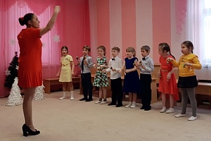 Музыкальный руководитель: Вот мы оказались в зимнем заснеженном лесу. Давайте послушаем, как шумит лес, как хрустит снег под ногами. А как много снежинок падает с неба! Как здесь красиво, и сейчас мы с вами споём про Снежинку.