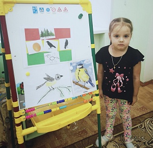 Воспитатель: Ребята, сегодня к нам в группу прилетела синичка. Она попросила ей помочь. Наступила зима, и птицам тяжело найти корм. Поэтому мы с вами и повесили кормушки на участке. У нашей синички День рождения, она хочет много рисунков со своим изображением. Но сначала синичка проверит, знаете ли вы зимующих и перелётных птиц? Она принесла вам карточки с их изображениями.Воспитатель: Давайте каждый возьмёт карточку и скажет название птицы и к какой группе она относится: зимующие или перелётные. Ребята, а чем они отличаются? (Ответы детей.) Перелётные птицы осенью улетают в тёплые края, а весной возвращаются; зимующие птицы остаются в своих краях. Люди помогают этим птицам (вешают кормушки), так как им трудно найти корм под снегом. (Сова – зимующая, ласточка – перелётная, воробей – зимующая, грач – перелётная, соловей – перелётная, ворона – зимующая, дикий гусь – перелётная, галка – зимующая, дикая утка – перелётная, синица – зимующая, лебедь – перелётная.)