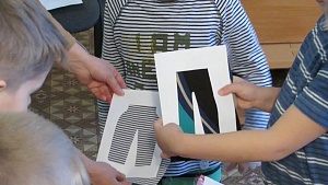 Воспитатель: Давайте рассмотрим старинные приспособления для ткачества. (Дети рассматривают расположение нитей на станке, челнок с нитью, чесалку и её работу по продвижению переплетенных нитей. Они поочерёдно продевают челнок с нитью между натянутых поперечных нитей.)