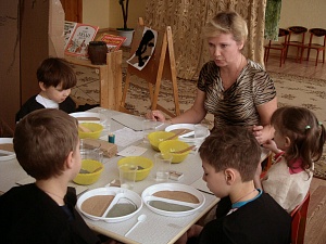 Педагог: Представьте, что мы живём в племени и хотим отправить послание соседям в другое племя. Вы уже знаете, что бумаги тогда ещё не было. Как быть? (Дети высказывают предположения.) У вас на столах песок и глина. Потрогайте их, возьмите лупы и внимательно рассмотрите. Скажите, что у них общего и чем они отличаются. (Дети изучают песок и глину; приходят к выводу о том, что оба вещества сыпучие, но песок состоит из отдельных песчинок, а глина - из пыли.)