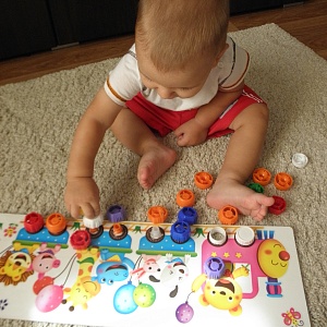 Примерно в 7 месяцев наш ребёнок начал особенно интересоваться такими предметами, катать, кидать, перекладывать их с места на место. И как раз в это время я совсем случайно увидела необычную игрушку ручной работы – развивающий паровозик и тут же её купила. Игрушка представляет собой развивающую доску с изображением паровозика, который везёт животных в вагончиках. Вся суть игрушки заключается в том, что колёсики у паровозика – это яркие крышечки, которые можно без труда откручивать и закручивать. Я была очень рада, что не ошиблась с выбором, ребёнок был в восторге от этой возможности. Доска хороша тем, что по мере своего роста и развития, ребёнок играет с ней по-разному, развивая постепенно те или иные навыки. Сначала малыш просто одевал колёса-крышечки, потом научится их закручивать и откручивать самостоятельно. С помощью изображений на доске мы выучили некоторых животных, какие они издают звуки, некоторые цвета и предметы.