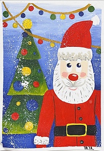 Заполним шарики на ёлке красным, синим, жёлтым цветом (можно пофантазировать и сделать ёлочные игрушки в других цветах). Деду Морозу красным цветом закрашиваем шапку и шубку. Не забываем про красный нос, ведь на улице мороз! А жёлтым цветом закрасим бляшку на поясе. Чёрными будут пояс, пуговки и зрачки глаз у главного героя. Серым цветом (чёрный смешать с белым) проработаем усы, бороду (небольшими полосками) и сделаем немного фактуры (тычками) на меховых частях одежды. Белым поставим блики на носу и в глазах. Нить гирлянды нарисуем коричневым цветом и «повесим» разноцветные фонарики.
