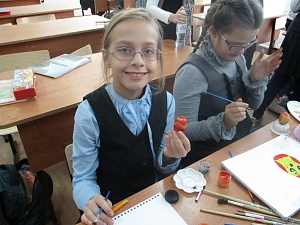 Учитель: Девочкам нужно нарисовать правильный овал для росписи яйца или овал с расширенным верхом для росписи ложки. Внутри них выполнить композицию в традиционном стиле народного промысла, или используя свободное творчество. (Девочки выполняют задание.)