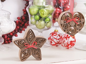 Есть что-то особенное в изготовлении своими руками рождественских украшений, которые будут храниться долгие годы. Всем нравятся ностальгические чувства, возникающие каждый год, когда наступает пора украшать дом к Рождеству! Это украшение в технике квиллинг будет также симпатичным подарком; вы можете даже сделать более мелкий вариант этого украшения для декорирования подарочных пакетов. Традиционно квиллинг подразумевает использование тонких полосок бумаги, свернутых разными завитками в рулончики разной формы, из которых затем составляют различные рисунки, но вы можете применять эту технику при работе с более плотным материалом вроде фигурного или гофрированного картона. При использовании гофрированного картона формы получаются гораздо большего размера, а результат достигается быстрее, чем при традиционном квиллинге. Если вы раньше не работали в технике квиллинг, тогда этот проект будет для вас хорошим стартом, поскольку с более крупными полосками проще работать. Гофрированный картон фирмы «Крафт» создаёт ощущение грубоватого деревенского изделия, и он очень хорошо сочетается с красной ленточкой и лентой в красно-белую клетку. Если вы собираетесь в это Рождество украсить своё жилище в стиле деревенского дома, тогда для этой цели отлично подойдёт наше квиллинговое украшение. Вы можете также поэкспериментировать с гофрированным картоном разных других цветов – прекрасно будут смотреться красный с зелёным, используйте также ленты других оттенков. Мы показали вам, как сделать квиллинговую звезду, которую легко поставить, но вы можете изготовить другие украшения – например, рождественскую ёлку или ангелов. Вам потребуется очень мало материала для создания этих украшений, так что начинайте осваивать эту великолепную технику.