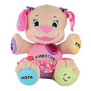 щенка, ставшего бестселлером бренда. А специально для девочек Fisher-Price® представляет новинку коллекции «Смейся и Учись» - Сестричку Учёного щенка с технологией Smart Stages! Новинка обладает всеми преимуществами интерактивной развивающей игрушки – она разговаривает, поёт песенки и реагирует на прикосновения. Знакомить маленьких принцесс с новой подружкой можно уже с 6 месяцев, когда растёт познавательный интерес и пальчики достаточно ловкие, чтобы нажимать на разные части тела игрушки. Очаровательная плюшевая игрушка порадует малышей ярким дружелюбным дизайном и интерактивными элементами, а родителей – уникальной технологией Smart Stages. Яркие детали и кнопка-сердечко на животике привлекут внимание крохи. Лапки, животик и ушки выделены разными цветами – при нажатии на них малыш сможет выучить названия частей тела и цветов.Технология Smart Stages легко подстраивается под уровень развития вашего ребёнка и позволяет выбирать один из трёх уровней игры: «Изучаем», «Побуждаем» или «Притворяемся». На каждом уровне обучения действия крохи будут вознаграждаться забавными песенками и весёлыми фразами.
