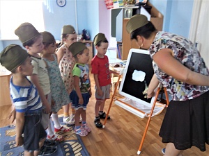 Воспитатель: Чтобы разведчиков не заметили, они надевают маскировочную пятнистую форму. Ваша задача замаскировать своих разведчиков. (Педагог выставляет на мольберт плакат с изображением леса.) Посмотрите на этот лес, как вы думаете, какие краски вам понадобятся? (Дети называют зелёный, жёлтый, коричневый цвет.) Посмотрите, как можно замаскировать разведчика. Берём кисточку, набираем жёлтую краску и наносим пятна в разных местах на силуэт солдата. Теперь наносим пятна зелёной и коричневой краской. Не забывайте промывать кисточку! Постарайтесь выполнить всё быстро и аккуратно. (Дети садятся за столы и выполняют задание.) Располагайте разведчиков в лесу. Посмотрим, хорошо ли вы их замаскировали. (Дошкольники прикрепляют силуэты солдат на плакат и оценивают успешность выполнения задания.)