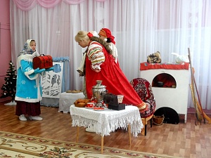 Настенька (кланяется Деду Морозу): Спасибо, Дедушка Мороз, за добрые слова и за подарки. (Садится на сани и едет по залу, бубенцы звенят. Смена декораций. В избу входит Настенька. Её встречают Мачеха, Марфуша и Отец.)