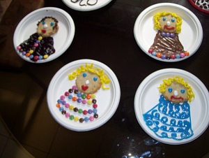 Пока выпечка остывает, делаем любой (!) крем. Делим приготовленный крем на три или более порций, которые подкрашиваем пищевыми красителями разных цветов. Раскладываем печенья или лепёшки по тарелкам – по одному печенью или по одной лепёшке на тарелке. Для прочности «сажаем» голову каждого эльфика на нанесённый на тарелку слой крема, используя крем как клей. Наполняем кулинарные шприцы или пластиковые пакеты разным по цвету кремом. «Рисуем» кремом лица эльфиков на печенье или лепёшках. Круглые печенья или лепёшки – это лица эльфиков. Рисуем на тарелках кремом волосы и / или головные уборы эльфиков. Под головой каждого эльфика рисуем кремом его накидку. Или делаем накидку из шоколадной пасты. Для накидки эльфика возможно использование джема.