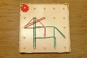 Используется в работе по развитию словесного творчества. Предложите детям нарисовать резинками свои собственные сказки, истории, загадки, стихотворения, перенести их на схему, а затем их рассказать. Очень хорошо, когда дети включаются в коллективную работу. Каждый иллюстрирует свою часть стихотворения или сказки, а затем планшеты объединяются в ряд и можно рассказать стихотворение от начала до конца.