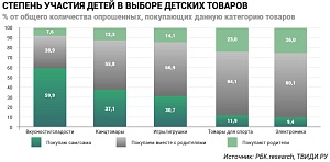 Как показали результаты опроса, современные дети в возрасте от 7 лет принимают активное участие в выборе детских товаров. Наиболее активно они ведут себя при выборе недорогих категорий товаров, таких как «вкусности/сладости», книги/журналы, канцтовары. При выборе игр и игрушек родители и дети играют равнозначную роль. 67% опрошенных детей в возрасте от 7 и до 15 лет заявили, что выбирают игры и игрушки совместно с родителями. И только около трети детей данной возрастной группы (30,7%) самостоятельно, не советуясь с родителями, выбирают игры и игрушки. Для небольшой доли детей (14%) игры и игрушки выбирают родители, не советуясь с ними.