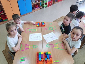 Воспитатель: Сюда мы с вами прилетели на ракете. Предлагаю построить самолёт для обратного путешествия. (Дети конструируют самолёты из блоков Дьенеша по предложенным схемам.)