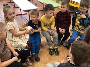 Кузя: Странно, только один мяч и всё! Что же с ним делать, как он может нам помочь и причём тут добрые слова? (Ответы детей. Дети встают в круг, Кузя передаёт «соседу» мяч и говорит комплимент, и так остальные участники.)