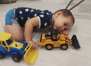 Вторая наша любимая игрушка – трактор-экскаватор, и это тоже строительная техника. Машинка яркого жёлтого цвета, яркая и привлекательная. Этот трактор с инерционным механизмом, но дети такого возраста не особо им интересуются. Сын воспроизводит звуки работающего трактора, воображая игровые сюжеты. Производителя этой игрушки назвать не могу, но трактор тоже хорошего качества, хотя пластмасса по качеству отличается от игрушки «Полесье». У этого трактора периодически отваливается ковш, что иногда огорчает ребёнка.
