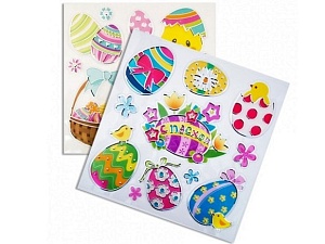 Не забудьте декоративные наклейки! Украсьте свой дом объёмными изображениями расписных яиц, пушистых цыплят и нежных цветов. Их можно наклеить на окна и зеркала, можно использовать при создании самодельных пасхальных открыток или украсить ими подарочные коробочки.