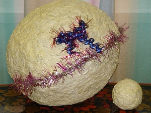Дед Мороз: (сердито) А я что — не волшебник?! (Достаёт из мешка киндер-сюрприз). Киндер маленький катись, да большим сюда явись! (Обычный киндер-сюрприз катится под волшебную музыку, а под веселую танцевальную музыку выходит большой киндер-сюрприз.)