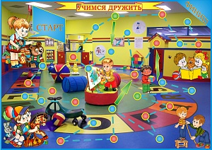 На столе разложены красные и синие карточки. Первый игрок кидает кубик, делает ход и, в соответствии с цветом поля, на которое он попал, берёт карточку. Педагог зачитывает задание, написанное на обратной стороне карточки, ребёнок его выполняет. Возможно коллективное обсуждение ответа на вопрос. Затем ход переходит к следующему игроку. Игра продолжается до тех пор, пока один из игроков не дойдёт до финиша.Вопросы на красных карточках: