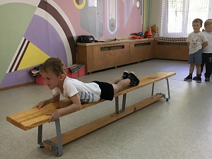Инструктор: Давайте будем прыгать так же, как кузнечик и ползать, как гусеницы. Я сейчас положу вам препятствия, а вам нужно будет их перепрыгнуть, как кузнечики. (Выполнение ОВД.) Какие вы молодцы! А теперь превращаемся в гусениц! Нужно проползти по этому мостику. (Инструктор указывает на скамейку. Основные виды движений: 1. Прыжки – перепрыгивание через 5 палок, лежащих на расстоянии 40 см друг от друга. Прыжки на двух ногах, используя энергичный взмах руками. 2. Ползание по гимнастической скамейке на животе (2 раза). Инструктор и воспитатель раскладывают в две линии гимнастические палки. Сначала дети выполняют прыжки. После инструктор и воспитатель собирают палки и ставят две скамейки. Дети ползают на животе по скамейке. Оба упражнения выполняются поточным способом двумя колоннами. Инструктор отмечает ребят, правильно выполнивших упражнения.)