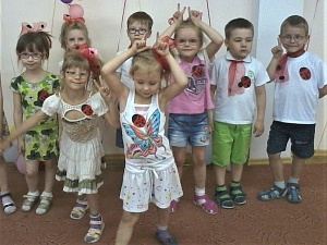 Хозяйка: Ловкие вы и быстрые. Все фигуры и движения правильно повторили. А сказки-то знаете? Давайте проверим. (Проводится игра «Угадай, из какой сказки предмет». Каждый ребёнок вытаскивает из коробки карточку с изображением предмета и называет сказку, в которой он встречается. Некоторые изображённые предметы и персонажи можно отнести к разным сказкам, в этом случае все участники игры помогают назвать разные сказки.) Молодцы ребята, все сказки угадали. Давайте Солнце порадуем, да научим его играть с платочком. (Дети встают парами, и с ними проводят в музыкальном сопровождении русскую народную игру «Ручеёк».)