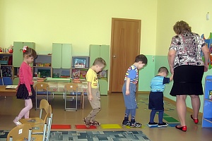 Воспитатель: Молодцы! Вы хорошо знаете признаки весны. Но Весна всё равно не появилась. Может, нам стоит отправиться в лес и там её поискать? Становитесь, друг за другом и пройдём по дорожке. (На полу расположены полоски разного цвета. Воспитатель с детьми идут по цветным полоскам.)