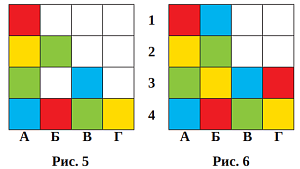 Далее поступаем аналогичным образом. Выберем, к примеру, третью строку и закрасим её недостающими цветами: красным и жёлтым (это очень легко, сделайте самостоятельно), затем столбец «Б» — и закрасим единственную свободную клетку в синий цвет. Получим то, что изображено на рис. 6.