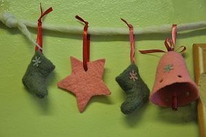 После того, как мы шерсть хорошенько проваляли, отбили-поколотили со всех сторон, она превратилась в войлок. Войлок — уже достаточно плотный материал, он не растягивается, ворсинки от него оторвать довольно трудно. Самое время вырезать из него какое-нибудь творение, например, ёлочку.Рисуем ёлочку — кому какая нравится, вырезаем её, накладываем на войлок, делаем выкройку. Рыхлые края вырезанной ёлочки необходимо довалять, чтобы они не обсыпались. Остатки мыльного раствора вполне подойдут для этого. Доделываем по знакомой уже технологии: валяем, промываем, отжимаем, не выкручивая. Проглаживаем через хлопчатобумажную ткань и высушиваем ёлочку.