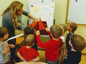 Воспитатель: Лисичка, дети знают стихотворение о весне и хотят его тебе рассказать. (Дошкольники хором читают стихотворение С. Маршака «Круглый год. Апрель». Затем предлагаю детям встать в круг и провожу с ними пальчиковую игру «Подснежник».)