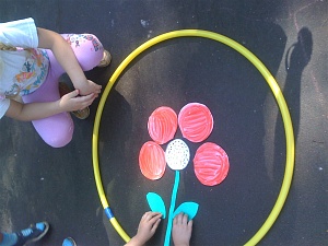 Педагог. У меня в руках лепестки от разных цветов. Попробуйте отгадать, с какого цветка лепесток, а если кто-то вспомнит, то пусть прочитает об этом цветке стихотворение. А потом на асфальте соберите каждый цветок из предложенных деталей.
