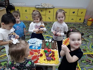 Воспитатель: Запомните картину и это движение. Сейчас мы обозначим время года предметом. Выберите предмет, который подходит к нашей картине. (Один ребёнок выбирает предмет, например, снежинку. Если ребёнок берёт неверный предмет, то советуемся со всеми детьми, делаем правильный выбор.) А теперь возьмите все по одной снежинке и покружитесь. (Каждый ребёнок берёт снежинку и повторяет движения.)