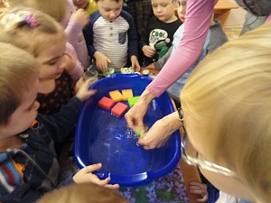 Малыши наблюдают за тем, как педагог взбивает пену и обращают внимание на то, какая она, какие звуки издаёт. Педагог предлагает детям пустить в плавание по пенящимся волнам губки и мыльницы, затем то же самое проделать в тазу с водой, сравнить, как они себя будут вести. Дети наблюдают за тем, в каком случае легче перемещать объекты: просто по воде или по поверхности густой пены. Педагог просит, чтобы малыши подули на свои лодочки. Малыши убеждаются в том, что не так-то просто лодочкам двигаться по поверхности из пены.