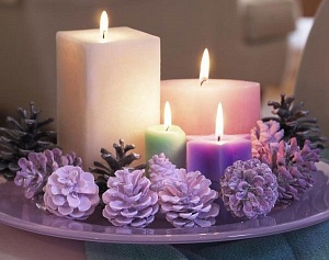 Так же веточки ели и шишки замечательно подойдут для оформления новогоднего света в доме. Свечи добавят таинственности и волшебства празднику. Украшенные в соответствующим стиле, они станут изюминкой всего новогоднего убранства дома. В детской комнате такую композицию нужно ставить в недоступном для ребёнка месте, вдали от легковоспламеняющихся предметов. Только представьте, как сладко будет малыш засыпать в комнате, наполненной ароматом хвои, шишек, под тихое сияние свечей.