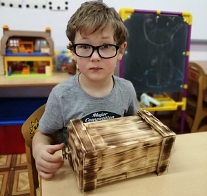 Второй проект – «Секретная шкатулка». Автором проекта является семья Степана Т. (6 лет). Коробка с секретом изготовлена из клееного хвойного дерева. Помимо простого механизма для открытия коробки, есть скрытый элемент, который блокирует механизм.