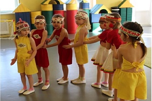 Мордовские игры и танцы. Под звуки народной мелодии мальчик и девочка с элементами мордовских национальных костюмов приветствуют детей: «Здравствуйте, ребята! Шумбрат! Добро пожаловать в Мордовию». Они приглашают на мордовский танец. Дошкольники выполняют тройные притопы, приседания, передвижения на носках, повороты вокруг себя с припаданиями.