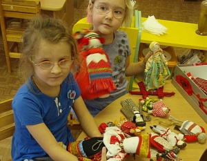 В нашем детском саду активно используются рукотворные игрушки. Уже в младшей группе дети с удовольствием обследуют сундучок с тряпичными куклами, сшитыми для них педагогом. Каждая кукла имеет ярко выраженный образ, дети определяют его безошибочно: мама, бабушка, папа, дедушка, сыновья и дочери. В зависимости от времени года воспитатель дополняет сундучок куклами: зимой в валенках и шубках, летом в сарафанах и лаптях. Куклы отличаются по росту и толщине. Ребёнку приятно держать в руках такую куклу, укачивать её, петь ей колыбельные. Тёплое, доверчивое отношение детей к традиционным куклам подтолкнуло автора этой статьи к тому, чтобы формировать соответствующую предметно-развивающую среду. В группе выделено пространство для игр с куклами, его украсили элементы рукотворного творчества: